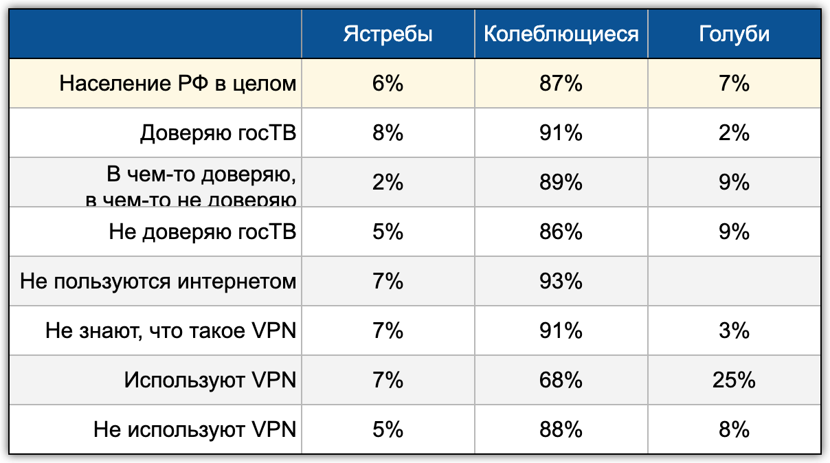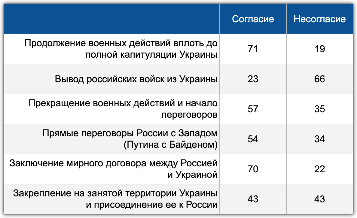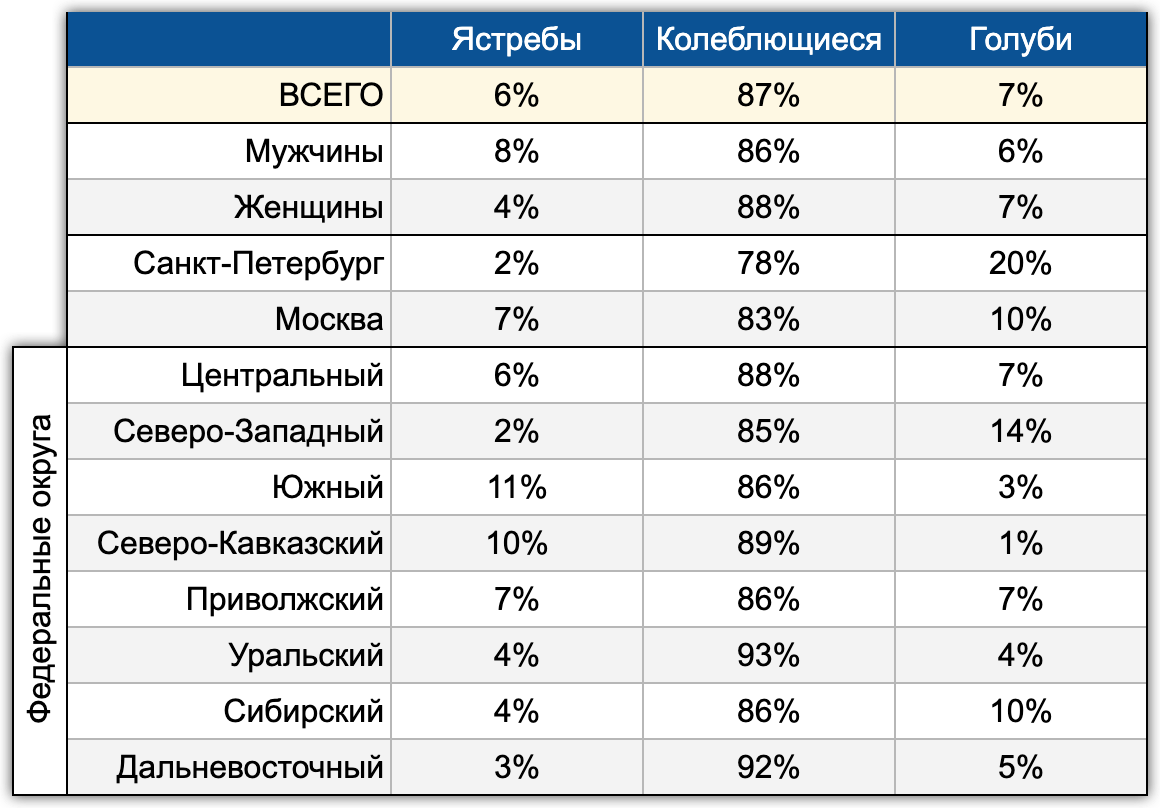 При доминировании провоенной точки зрения на конфликт, сторонников последовательной антиукраинской политики, то есть тех, кто считает, что соседнее государство должно быть оккупировано и аннексировано, а переговоры и мир с ним невозможны, не так много — 6%. Доли твердых «ястребов» и последовательных «голубей» вполне сопоставимо — 6 и 7% соответственно. Конечно, это не «реальное» число сторонников и противников вторжения, а лишь их наиболее последовательные фракции. Так, относящиеся к «ястребам» люди четко понимают цели, которые перед собой ставит руководство страны, и поддерживают его в этом. Есть другая, огромная часть населения, которая, возможно, и знает об истинных целях России в Украине, но пока не готова их разделить, поддерживая лишь официально заявленные цели.