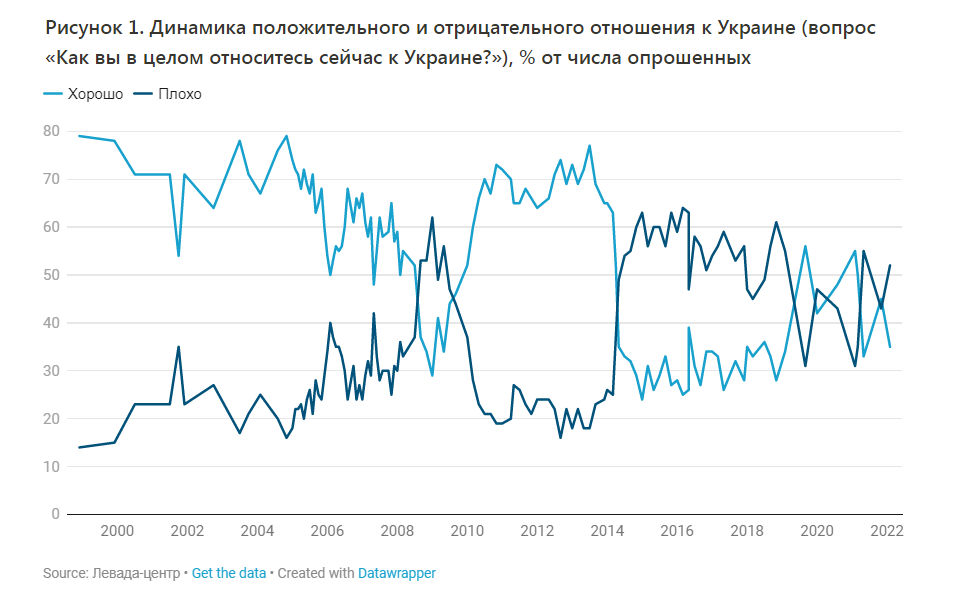 Таким образом, в независящих друг от друга социологических проектах получены данные, позволяющие утверждать, что антиукраинские настроения той или иной степени напряжения сопровождали весь период формирования европейской ориентации этой страны, ее стремление к независимости от Москвы, а антиукраинская тема на федеральных телевизионных каналах во многом была их источником и поддерживала их. Более чем двадцатилетний мониторинг дает представление о динамике настроений российских граждан по этому поводу. Начав с высокоположительных значений, видимо, наследственно советских (80% опрошенных во всероссийском мониторинге), оценки в настроениях сдвинулись с места и сначала медленно, но потом с ускорением покатились вниз. И все-таки они не были однозначными, негативизм то рос, то падал. Падение негативизма, явно позитивный настрой к Украине приходятся на короткий промежуток между 2010 и 2014 годами, когда в отношениях наших стран ничего особенного не происходило и они восстанавливались, нормализовались, но в других ситуациях он снова рос, и это было связано с чередой значимых событий, начало которых в нашу эпоху датируется нулевыми годами 2000-х.