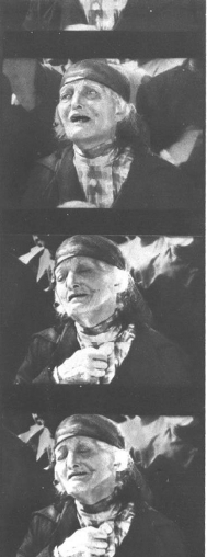 Я почувствовал уверенность в том, что открытый смысл существует, когда рассматривал кадр V. Меня преследовал вопрос: что в этой плачущей старухе заставляет думать об означающем? Скоро я понял, что это не выражение лица (хотя оно и отточено до совершенства) и не жест страдания (закрытые веки, напряженный рот, кулак, прижатый к груди) — все это относилось к полному значению, к «естественному смыслу» изображения, к эйзенштейновскому реализму и декоративизму. Я чувствовал, что упорная, беспокоящая черточка (как непрошеный гость, который не желает уходить и сидит молча, хотя от него все хотели бы избавиться) должна находиться где-то у лба: платок здесь играет свою роль18.