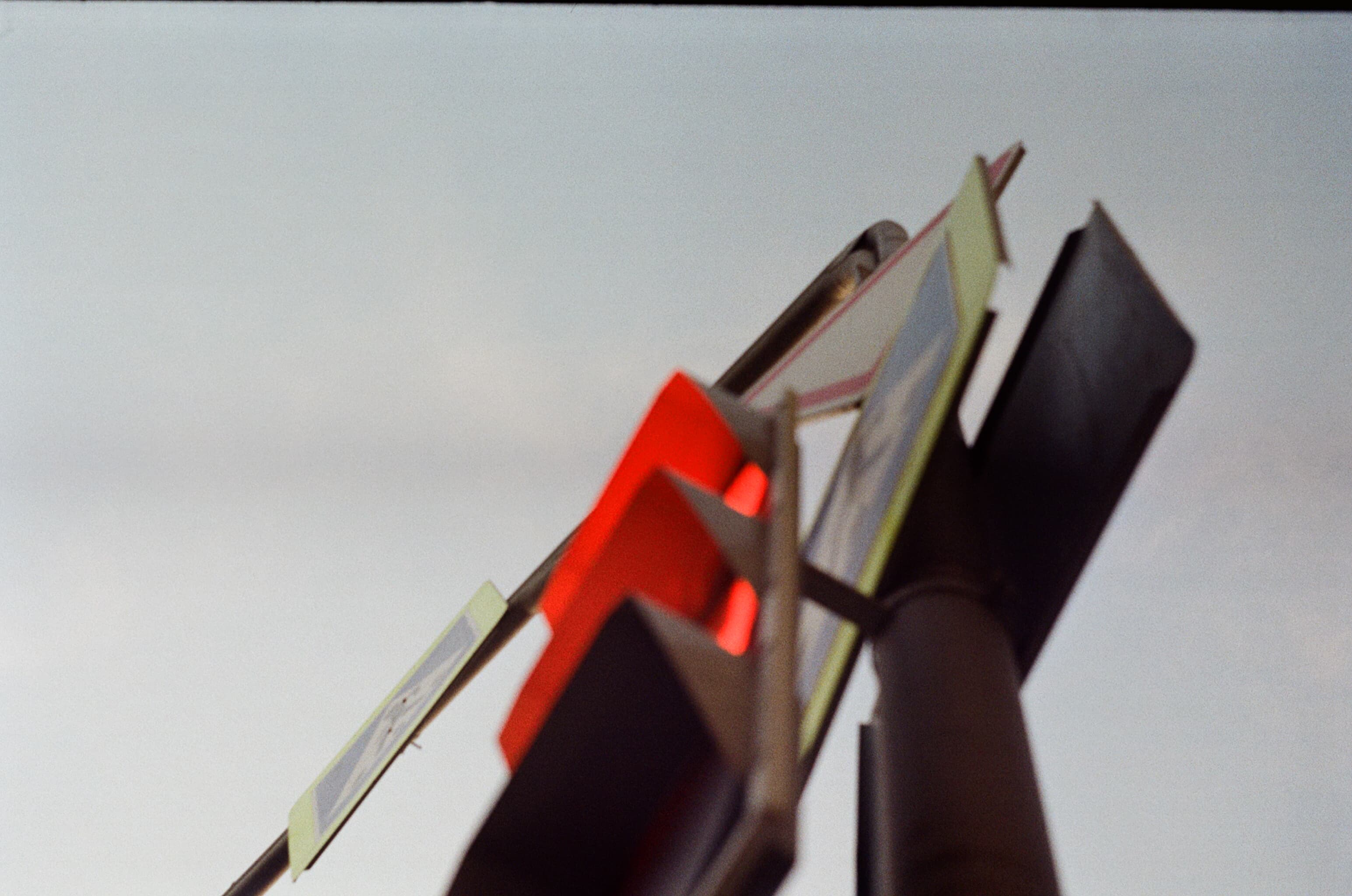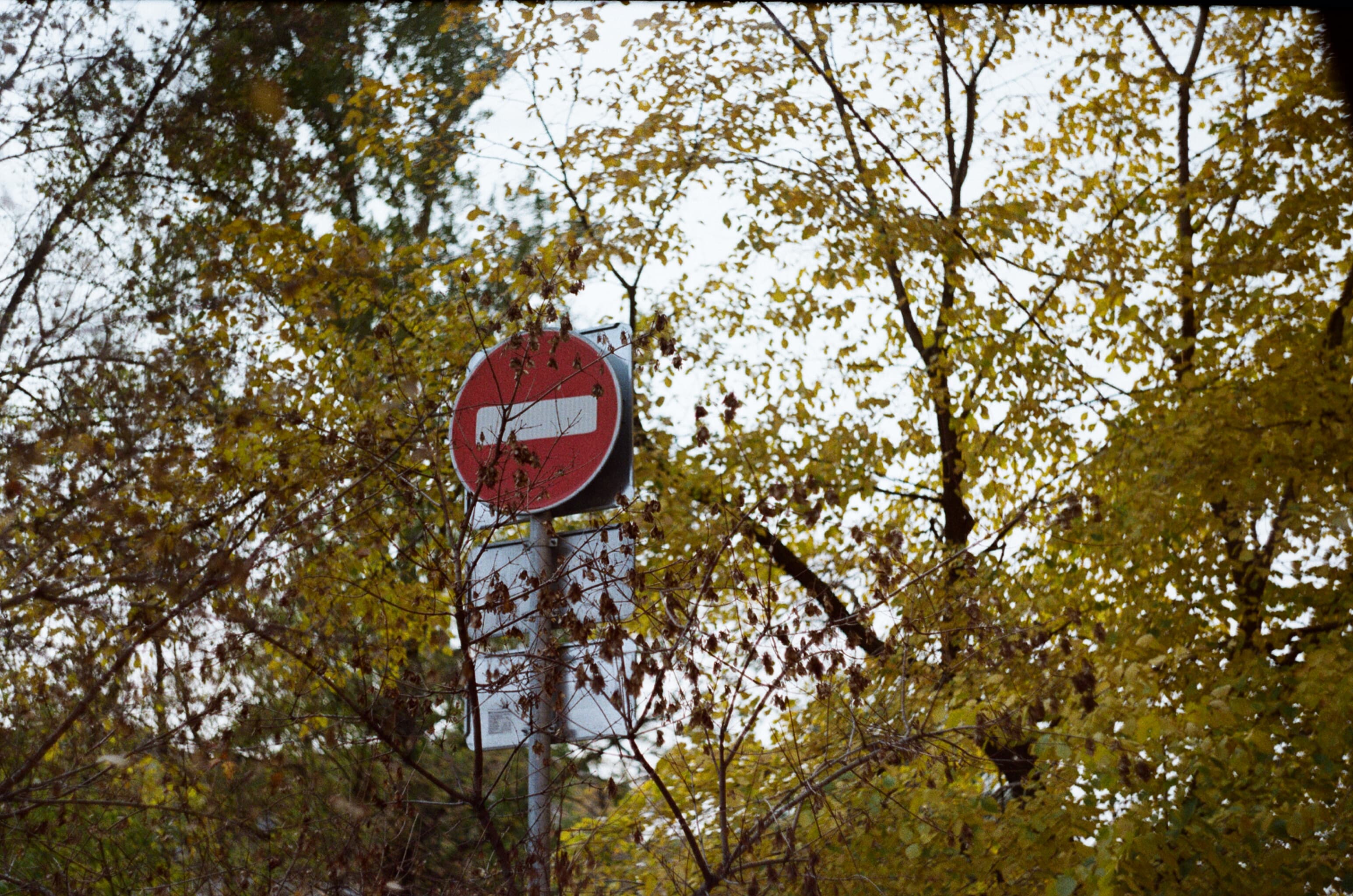 Я карабкаюсь в горку по малоизвестной дороге к отчему дому и встречаю давнишнего «знакомого». Своей краснотой он отдает дань памяти коммунизму, своей формой он тяготеет к силуэту Солнца. Белая полоска, горизонтальным почти-диаметром разделяющая эмалированный металл на полукруги, напоминает больничный бинт. Будто дорожный знак «кирпич» связывает все свои образы этим «марлевым куском» воедино.