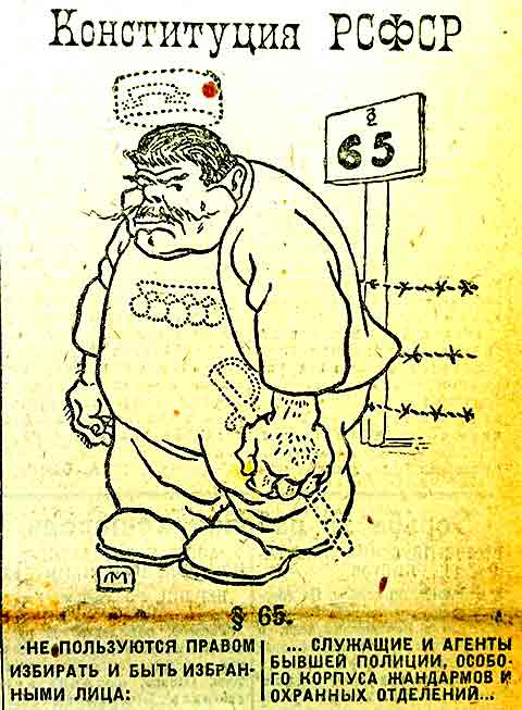 Враги внутренние — это «паразитические слои общества», кои надлежало уничтожать посредством введения всеобщей трудовой повинности6. Но одной трудовой повинности для борьбы с внутренним врагом было явно недостаточно. III Всероссийский съезд Советов Рабочих, Солдатских и Крестьянских Депутатов счел, «что эксплуататорам не может быть места ни в одном из органов власти»7. Во исполнение решения съезда ст. 65 Конституции подробно регламентировала перечень лишенных права избирать и быть избранных представителей эксплуататорских и не только эксплуататорских классов: а) лица, прибегающие к наемному труду с целью извлечения прибыли; б) лица, живущие на нетрудовой доход, как-то: проценты с капитала, доходы с предприятий, поступления с имущества и т. п.; в) частные торговцы, торговые и коммерческие посредники; г) монахи и духовные служители церквей и религиозных культов; д) служащие и агенты бывшей полиции, особого корпуса жандармов и охранных отделений, а также члены царствовавшего в России дома.